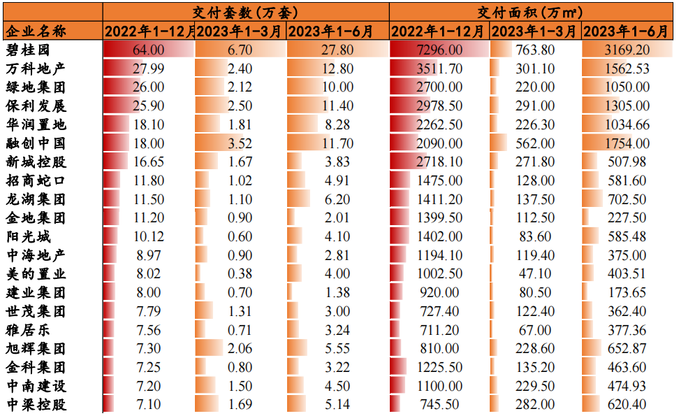 好在碧桂园一直是保交楼第一名,遥遥领先其他房企,2022年交付了64万套,2023年1-6月共交付27.8万套: