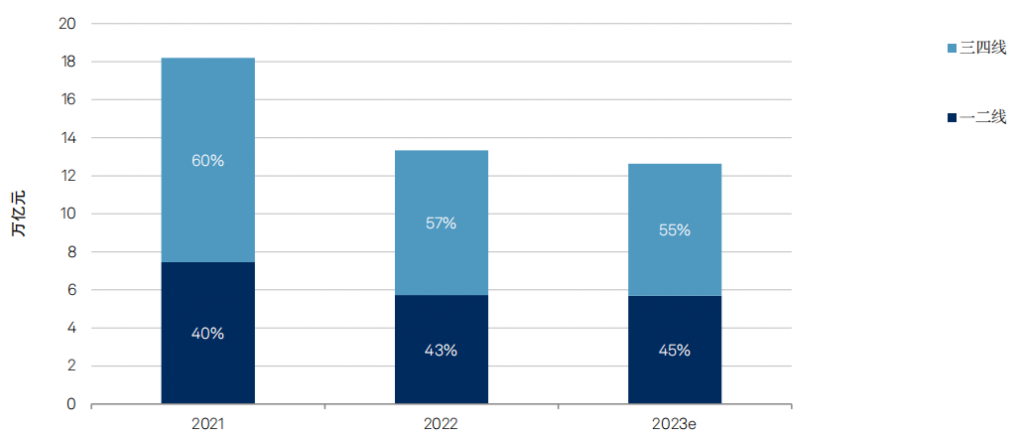 标普全球评级认为,高线城市(一二线)的销售正在企稳,低线城市却在萎缩。预计 2023 年一二线城市商品房销售额将小幅增长 3%左右,同期三四线城市销售额将下降约10%。