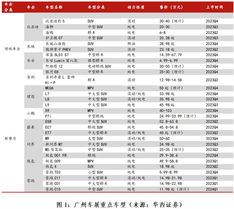 2023年第二十一届广州国际汽车展览会于11月17日至26日,在中国进出口商品交易会展馆举办,展会规模达22万平方米,展车总数达1132台,其中全球首发车59台、概念车20台、新能源车469台;新能源占比高新车类型来看,全新/新年款/换代分别 39/12/8 款;能源类型统计来看,纯电/燃油/插混/轻混/增程分别为 32/27/9/2/1 款。B 级和 C 级新车最多,自主品牌占比高,参展 SUV 与轿车数量占比基本持平,SUV 主要集中在 A 级至 C 级细分市场,轿车主要为 B 级与 C 级,自主品牌成为主要亮点参展车型数量最多,德系品牌紧随其后。