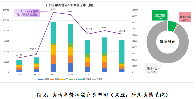 根据乐思舆情系统,11.15-11.20全网广州车展相关舆情共400538篇,声量连续多日维持高位,媒体对各种车型进行了广泛的报道和评论。其中疑似负面只占0.71%,主要是关于广州车展的失意者、一汽丰田被经销商集团维权、理想MEGA车顶螺栓遭网友调侃“原厂拼接车”、理想宣传被岚图高管怒怼、蔚来裁员风波和“倒闭”传闻、极氪007官方宣传视频被指造假、广州车展最让人失望的三款车、雷克萨斯展台为何如此冷清等话题。疑似正面信息占7.88%,主要是各新车首发上市、销量看涨、现场多台收获订单、新技术应用等话题。