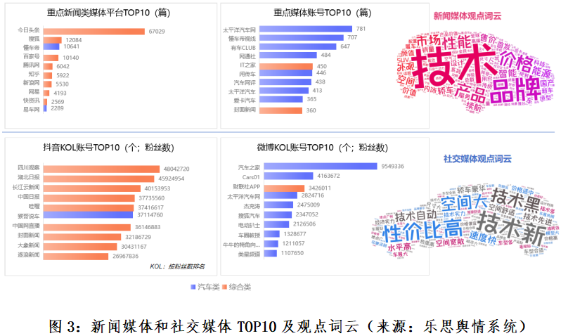 从媒体分布看,11.15-11.20六天,新闻类媒体占比22.5%,其中发文最高的媒体账号是太平洋汽车网、懂车帝视线、有车CLUB等,如下图所示;社交媒体中抖音占比11.4%最高、其次是微博占比4.0%,按粉丝数排名的前十KOL如下图,抖音KOL以综合类账号为主,而微博KOL主要是汽车垂类的作者。