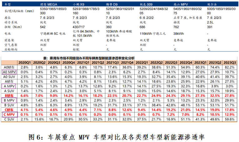 2023 年 1-9 月,MPV 国内市场零售同比增长 18%;其中,B 级以上车型增长 40%,而 A 级下降 10%,A0 级下降 27%,体现了车辆大型化、车型升级更新的变化趋势。从渗透率和销量占比来看,MPV 市场中新能源渗透率呈上升趋势,2021、2022和 2023 年 1-6 月新能源渗透率分别达 4.1%、9.8%、20.3%,其中高端新能源 MPV车型销量占比呈上升趋势,2021—2022 年占比分别为 0.5%、22.8%,而 2023 年1-6 月高端车型占比上升到 80.2%,上升态势明显。