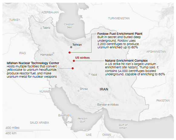 美国总统唐纳德·J·特朗普表示: “我们已完成对伊朗福尔多、纳坦兹及伊斯法罕三处核设施的成功打击。所有战机均已撤离伊朗领空——其中福尔多主设施遭受了炸弹的主要攻击。美军全体作战机组正在安全返航。