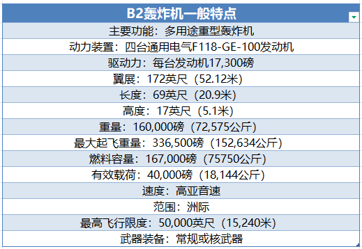 作为一种多用途轰炸机,它能够运载常规弹药和核弹药。在不加油的情况下,它的航程大约是6000海里(9600公里)。B-2的隐身性能源于其红外、声学、电磁、视觉及雷达等多重信号特征的同步降低。这些特征使其能够有效规避先进防御系统的探测、追踪和攻击。