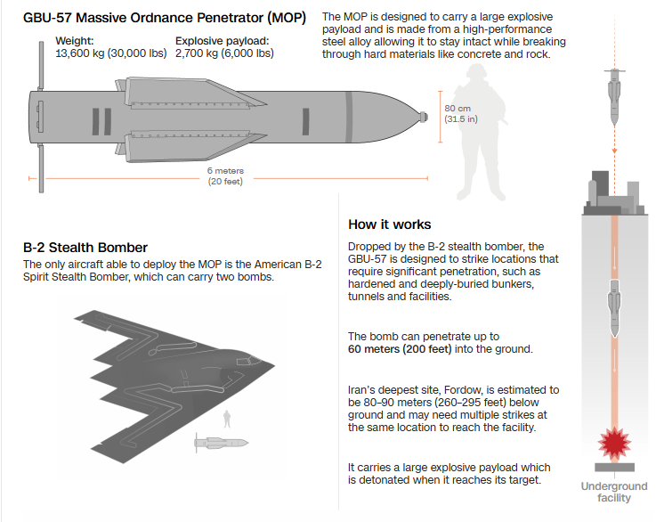 据两名知情人士透露,美军在对伊朗核设施的空袭中动用了GBU-57A/B型“巨型钻地弹”(MOP)——俗称“掩体炸弹”。