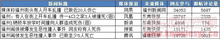 综合乐思舆情监测系统28日的数据,截至当天17时,福州闽侯恶性撞人事件话题媒体报道量达389篇,新浪、腾讯微博议论量达31511条。仅新浪、凤凰、网易、搜狐、腾讯平台的单篇报道参与人数超过10万人,跟帖近15000条。最热单篇网络新闻来自网易的报道。从网友的跟帖来看,呼吁对凶手严惩的声音最高。