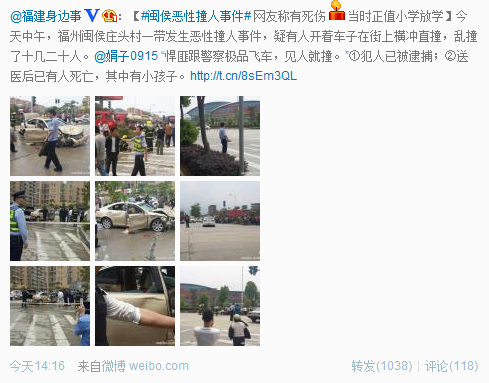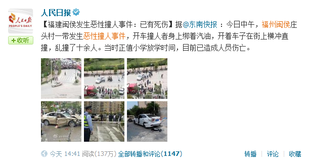 @ 东南快报:①犯人已被逮捕,他车上自带煤气罐,防爆队赶到现场,差点爆炸,好在没事;②送医后已有人死亡,其中有小孩子,受伤严重的已转往福州市的医院。