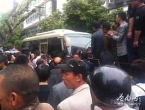 灵溪大门路与康乐路交叉,城管执法时与一女菜贩发生争执,一过路男子拿起手机拍照,城管见有人拍照,纠集四个参与执法的外地人拦住男子,并用榔头击打,男子倒地吐血。现在围观群众将受伤男子送往医院抢救,而四个打人者则躲进车里。