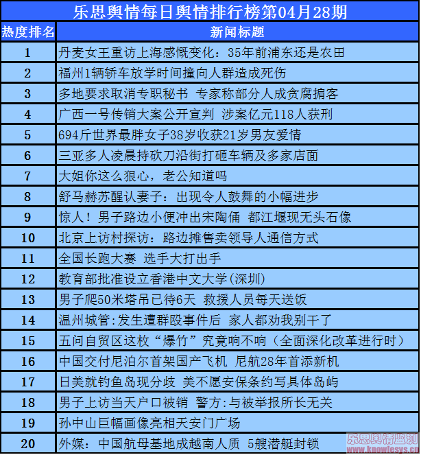 2014年4月28日乐思每日舆情热点排行榜导读:丹麦女王重访上海感慨变化:35年前浦东还是农田;福州1辆轿车放学时间撞向人群造成死伤;多地要求取消专职秘书 专家称部分人成贪腐掮客;广西一号传销大案公开宣判 涉案亿元118人获刑;694斤世界最胖女子38岁收获21岁男友爱情……