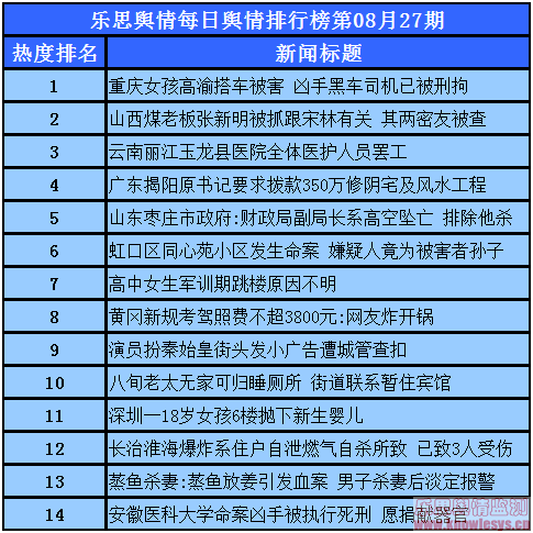 2014年8月27日乐思每日舆情热点排行榜导读:重庆女孩高渝搭车被害 凶手黑车司机已被刑拘;山西煤老板张新明被抓跟宋林有关 其两密友被查;云南丽江玉龙县医院全体医护人员罢工;广东揭阳原书记要求拨款350万修阴宅及风水工程;山东枣庄市政府:财政局副局长系高空坠亡 排除他杀……