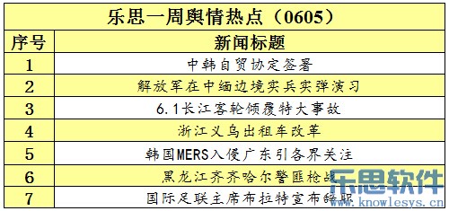 导读:6月5日,乐思一周舆情热点梳理统计:中韩自贸协定签署;解放军在中缅边境实兵实弹演习;6.1长江客轮倾覆特大事故;浙江义乌出租车改革;国际足联主席布拉特宣布辞职……